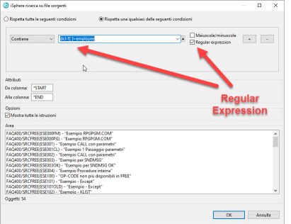 B) La ricerca dei file sorgenti può essere anche fatta utilizzando le Regular Expression che possono aiutare a fare delle ricerche più complete: facciamo un esempio con la ricerca della stringa “dcl-f employee”: se avessimo dei sorgenti con questa istruzione scritta in modi differenti … ad esempio con degli spazi tra dcl-f ed employee … (ad esempio “dcl-f employee” , “dcl-f employee”, “dcl-f employees” ecc), potremmo utilizzar proprio una regular expression per trovare tutti questi sorgenti… immettendo la regular expression ” “dcl-f[ ]+employee” oppure “dcl-f +employee”